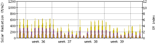 Das goldene Histogramm zeigt die totale Sonnestrahlung in W/m^2, die Skala befindet sich am linken Rand. Die violette Kurve zeigt den UV index, mit der Skala am rechten Rand. Man beachte, dass nach Schneefall die Messwerte nicht zuverlässig sind, weil die Sensoren nicht automatisch vom Schnee befreit werden. |