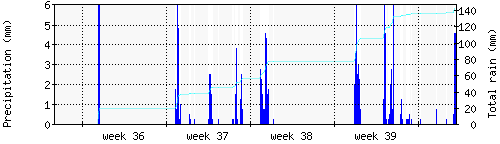 Das blaue Histogram zeigt die totale Niederschlagsmenge (oder deren Wassergehalt) in mm während des Messintervals. |