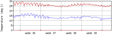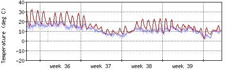Die rote Kurve zeigt die Innentemperatur,die hellrote Fläche zeigt den Bereichh zwischen höchster und tiefster Temperatur während des Messzeitraums. |