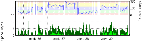 Der untere Teil des Graphen zeigt in hellgrün die mittlere Windgeschwindigkeit, die Spitzengeschwindigkeit ist dunkelgrün dargestellt, die zugehörige Skala findet sich am linken Rand. Der obere Teil des Graphen zeigt das Wind-Azimut in blau, die Skala steht am rechten Rand. |