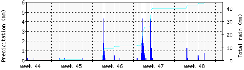 Das blaue Histogram zeigt die totale Niederschlagsmenge (oder deren Wassergehalt) in mm während des Messintervals. |