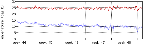 Die rote Kurve zeigt die Innentemperatur,die hellrote Fläche zeigt den Bereichh zwischen höchster und tiefster Temperatur während des Messzeitraums. |