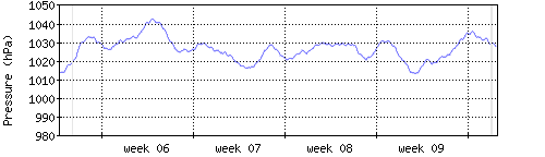 Der blaue Graph zeigt den mittleren Luftdruck, der Bereich zwischen grösstem und kleinstem Druck während des Messintervals ist in hellblau dargestellt. |