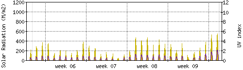 Das goldene Histogramm zeigt die totale Sonnestrahlung in W/m^2, die Skala befindet sich am linken Rand. Die violette Kurve zeigt den UV index, mit der Skala am rechten Rand. Man beachte, dass nach Schneefall die Messwerte nicht zuverlässig sind, weil die Sensoren nicht automatisch vom Schnee befreit werden. |