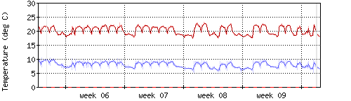 Die rote Kurve zeigt die Innentemperatur,die hellrote Fläche zeigt den Bereichh zwischen höchster und tiefster Temperatur während des Messzeitraums. |