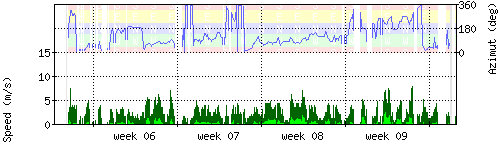 Der untere Teil des Graphen zeigt in hellgrün die mittlere Windgeschwindigkeit, die Spitzengeschwindigkeit ist dunkelgrün dargestellt, die zugehörige Skala findet sich am linken Rand. Der obere Teil des Graphen zeigt das Wind-Azimut in blau, die Skala steht am rechten Rand. |