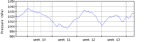 Der blaue Graph zeigt den mittleren Luftdruck, der Bereich zwischen grösstem und kleinstem Druck während des Messintervals ist in hellblau dargestellt. |