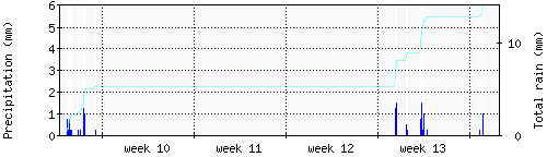 Das blaue Histogram zeigt die totale Niederschlagsmenge (oder deren Wassergehalt) in mm während des Messintervals. |
