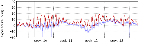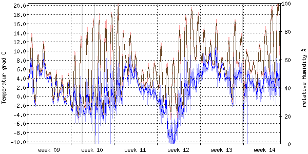 Die rote Kurve zeigt die Temperatur, die hellrote Fläche zeigt den Bereich zwischen höchsten und niedrigsten Temperatur während des Messintervals. Die blaue Kurve zeigt den Taupunkt, also die Temperatur, bei der sich Tau zu bilden beginnt. |