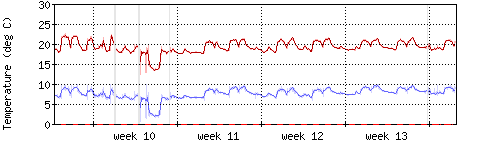 Die rote Kurve zeigt die Innentemperatur,die hellrote Fläche zeigt den Bereichh zwischen höchster und tiefster Temperatur während des Messzeitraums. |