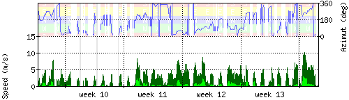 Der untere Teil des Graphen zeigt in hellgrün die mittlere Windgeschwindigkeit, die Spitzengeschwindigkeit ist dunkelgrün dargestellt, die zugehörige Skala findet sich am linken Rand. Der obere Teil des Graphen zeigt das Wind-Azimut in blau, die Skala steht am rechten Rand. |