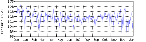 Der blaue Graph zeigt den mittleren Luftdruck, der Bereich zwischen grösstem und kleinstem Druck während des Messintervals ist in hellblau dargestellt. |