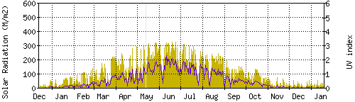 Das goldene Histogramm zeigt die totale Sonnestrahlung in W/m^2, die Skala befindet sich am linken Rand. Die violette Kurve zeigt den UV index, mit der Skala am rechten Rand. Man beachte, dass nach Schneefall die Messwerte nicht zuverlässig sind, weil die Sensoren nicht automatisch vom Schnee befreit werden. |