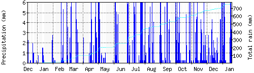 Das blaue Histogram zeigt die totale Niederschlagsmenge (oder deren Wassergehalt) in mm während des Messintervals. |