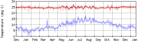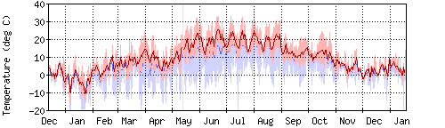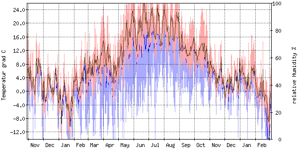 Die rote Kurve zeigt die Temperatur, die hellrote Fläche zeigt den Bereich zwischen höchsten und niedrigsten Temperatur während des Messintervals. Die blaue Kurve zeigt den Taupunkt, also die Temperatur, bei der sich Tau zu bilden beginnt. |