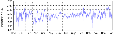 Der blaue Graph zeigt den mittleren Luftdruck, der Bereich zwischen grösstem und kleinstem Druck während des Messintervals ist in hellblau dargestellt. |