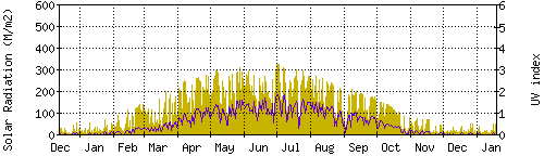 Das goldene Histogramm zeigt die totale Sonnestrahlung in W/m^2, die Skala befindet sich am linken Rand. Die violette Kurve zeigt den UV index, mit der Skala am rechten Rand. Man beachte, dass nach Schneefall die Messwerte nicht zuverlässig sind, weil die Sensoren nicht automatisch vom Schnee befreit werden. |