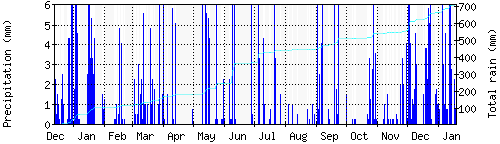Das blaue Histogram zeigt die totale Niederschlagsmenge (oder deren Wassergehalt) in mm während des Messintervals. |