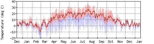 Die rote Kurve zeigt die Temperatur, die hellrote Fläche zeigt den Bereich zwischen höchsten und niedrigsten Temperatur während des Messintervals. Die blaue Kurve zeigt den Taupunkt, also die Temperatur, bei der sich Tau zu bilden beginnt. |