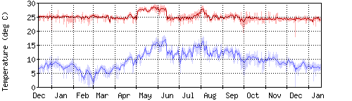 Die rote Kurve zeigt die Innentemperatur,die hellrote Fläche zeigt den Bereichh zwischen höchster und tiefster Temperatur während des Messzeitraums. |