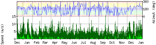 Der untere Teil des Graphen zeigt in hellgrün die mittlere Windgeschwindigkeit, die Spitzengeschwindigkeit ist dunkelgrün dargestellt, die zugehörige Skala findet sich am linken Rand. Der obere Teil des Graphen zeigt das Wind-Azimut in blau, die Skala steht am rechten Rand. |