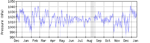 Der blaue Graph zeigt den mittleren Luftdruck, der Bereich zwischen grösstem und kleinstem Druck während des Messintervals ist in hellblau dargestellt. |