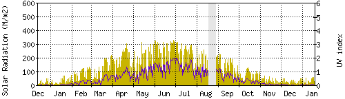 Das goldene Histogramm zeigt die totale Sonnestrahlung in W/m^2, die Skala befindet sich am linken Rand. Die violette Kurve zeigt den UV index, mit der Skala am rechten Rand. Man beachte, dass nach Schneefall die Messwerte nicht zuverlässig sind, weil die Sensoren nicht automatisch vom Schnee befreit werden. |