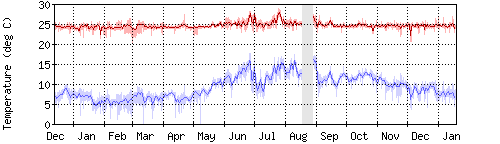 Die rote Kurve zeigt die Temperatur, die hellrote Fläche zeigt den Bereich zwischen höchsten und niedrigsten Temperatur während des Messintervals. Die blaue Kurve zeigt den Taupunkt, also die Temperatur, bei der sich Tau zu bilden beginnt. |