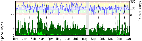 Der untere Teil des Graphen zeigt in hellgrün die mittlere Windgeschwindigkeit, die Spitzengeschwindigkeit ist dunkelgrün dargestellt, die zugehörige Skala findet sich am linken Rand. Der obere Teil des Graphen zeigt das Wind-Azimut in blau, die Skala steht am rechten Rand. |