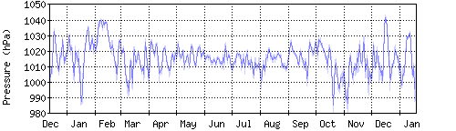 Der blaue Graph zeigt den mittleren Luftdruck, der Bereich zwischen grösstem und kleinstem Druck während des Messintervals ist in hellblau dargestellt. |
