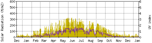 Das goldene Histogramm zeigt die totale Sonnestrahlung in W/m^2, die Skala befindet sich am linken Rand. Die violette Kurve zeigt den UV index, mit der Skala am rechten Rand. Man beachte, dass nach Schneefall die Messwerte nicht zuverlässig sind, weil die Sensoren nicht automatisch vom Schnee befreit werden. |