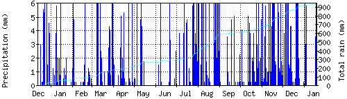 Das blaue Histogram zeigt die totale Niederschlagsmenge (oder deren Wassergehalt) in mm während des Messintervals. |