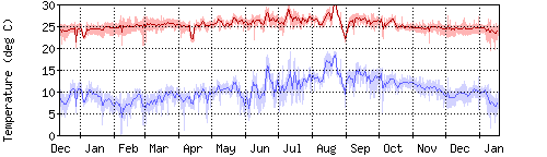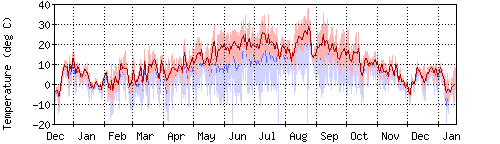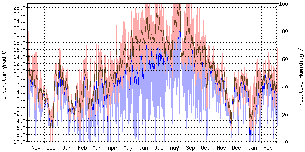 Die rote Kurve zeigt die Temperatur, die hellrote Fläche zeigt den Bereich zwischen höchsten und niedrigsten Temperatur während des Messintervals. Die blaue Kurve zeigt den Taupunkt, also die Temperatur, bei der sich Tau zu bilden beginnt. |
