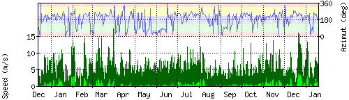 Der untere Teil des Graphen zeigt in hellgrün die mittlere Windgeschwindigkeit, die Spitzengeschwindigkeit ist dunkelgrün dargestellt, die zugehörige Skala findet sich am linken Rand. Der obere Teil des Graphen zeigt das Wind-Azimut in blau, die Skala steht am rechten Rand. |