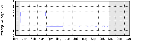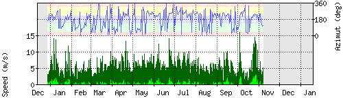 Der untere Teil des Graphen zeigt in hellgrün die mittlere Windgeschwindigkeit, die Spitzengeschwindigkeit ist dunkelgrün dargestellt, die zugehörige Skala findet sich am linken Rand. Der obere Teil des Graphen zeigt das Wind-Azimut in blau, die Skala steht am rechten Rand. |