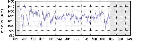 Der blaue Graph zeigt den mittleren Luftdruck, der Bereich zwischen grösstem und kleinstem Druck während des Messintervals ist in hellblau dargestellt. |