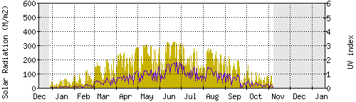 Das goldene Histogramm zeigt die totale Sonnestrahlung in W/m^2, die Skala befindet sich am linken Rand. Die violette Kurve zeigt den UV index, mit der Skala am rechten Rand. Man beachte, dass nach Schneefall die Messwerte nicht zuverlässig sind, weil die Sensoren nicht automatisch vom Schnee befreit werden. |