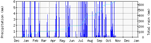 Das blaue Histogram zeigt die totale Niederschlagsmenge (oder deren Wassergehalt) in mm während des Messintervals. |