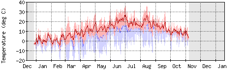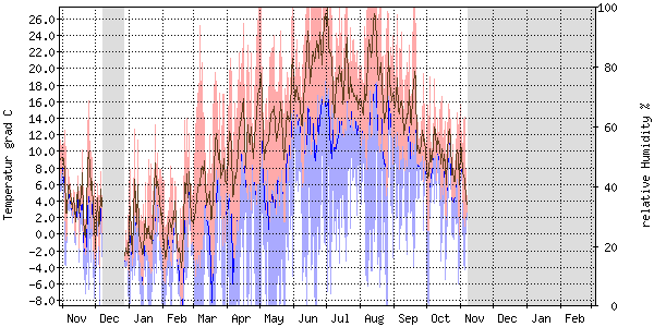 Die rote Kurve zeigt die Temperatur, die hellrote Fläche zeigt den Bereich zwischen höchsten und niedrigsten Temperatur während des Messintervals. Die blaue Kurve zeigt den Taupunkt, also die Temperatur, bei der sich Tau zu bilden beginnt. |