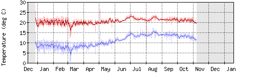 Die rote Kurve zeigt die Innentemperatur,die hellrote Fläche zeigt den Bereichh zwischen höchster und tiefster Temperatur während des Messzeitraums. |